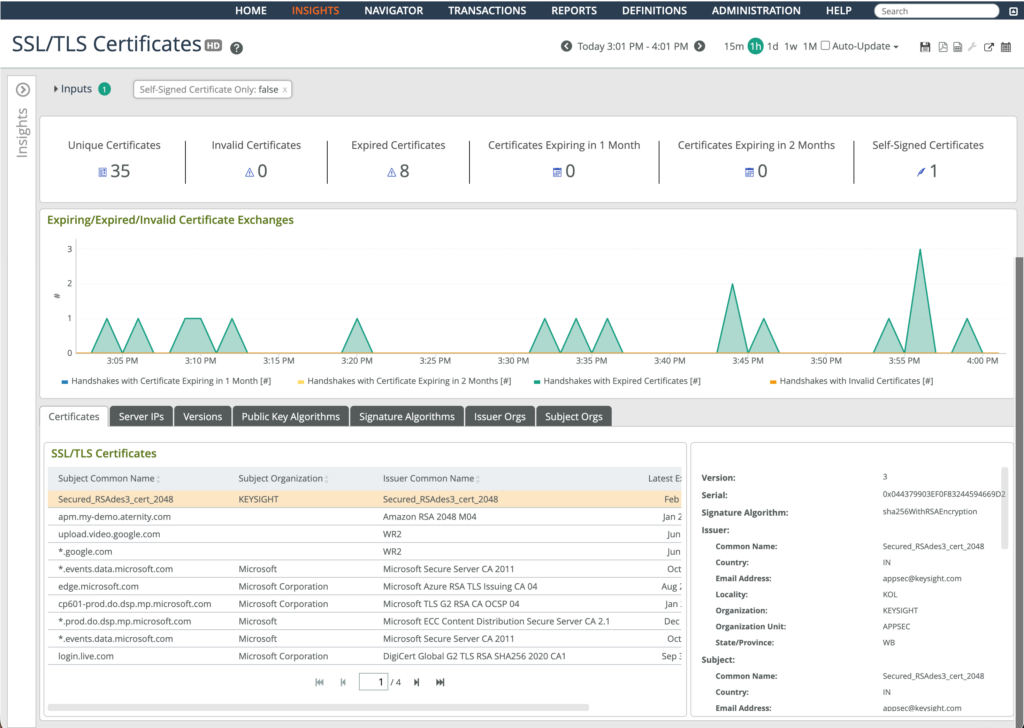- Understand certificate usage in real traffic: AppResponse shows which certificates are actively in use and alerts when they approach expiration, helping teams focus on the certificates that affect production.