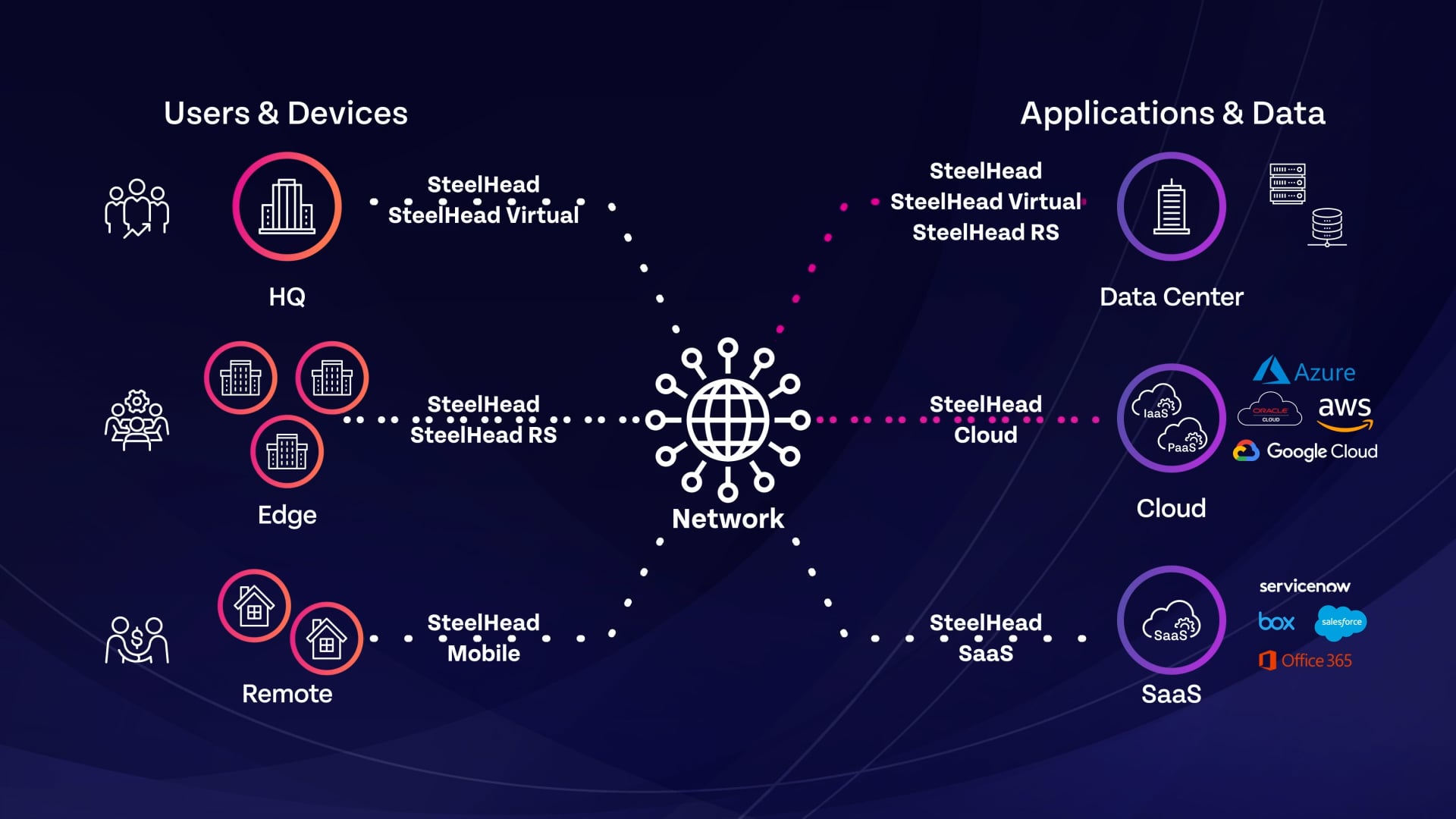 Riverbed SteelHead Cloud is an Infrastructure-as-a-Service (IaaS) environment that runs on leading IaaS platforms such as Microsoft Azure, AWS and Oracle Cloud to accelerate migration and access to workloads through proven data, transport and application streamlining, ultimately increasing time to market, enhancing employee productivity, and delivering maximum cloud value to the business.