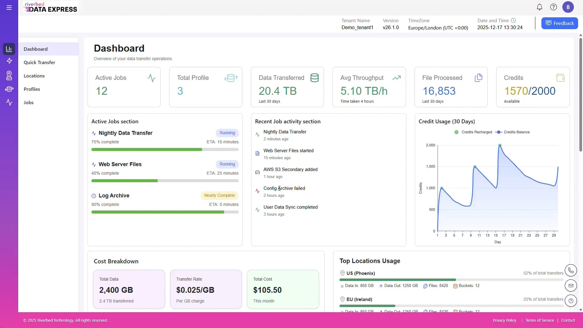 Riverbed Data Express enables enterprises to radically accelerate the movement of massive datasets now required to prepare and deploy AI models at scale—reaching data transfer speeds up to 10 times faster than current industry solutions —improving a customer’s time to value and lowering costs. With the new Riverbed Data Express Service, what once took months can now be completed in days—giving organizations the speed and security of easy data delivery now required to prosper in the AI era.